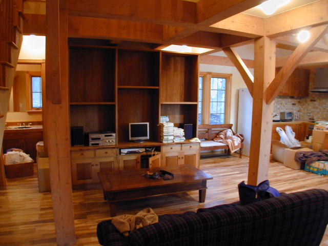 リビングの中央にでんと鎮座ましている極大本棚は前の家からの持込。北海道ミズナラの総無垢製の大物である。実は以前は吹き抜け部分においていたので、高さに無頓着で作ったら、今回の家では上の梁にぎりぎりの高さで収まった。あと1cm高ければ、梁を削る羽目に陥っていた。